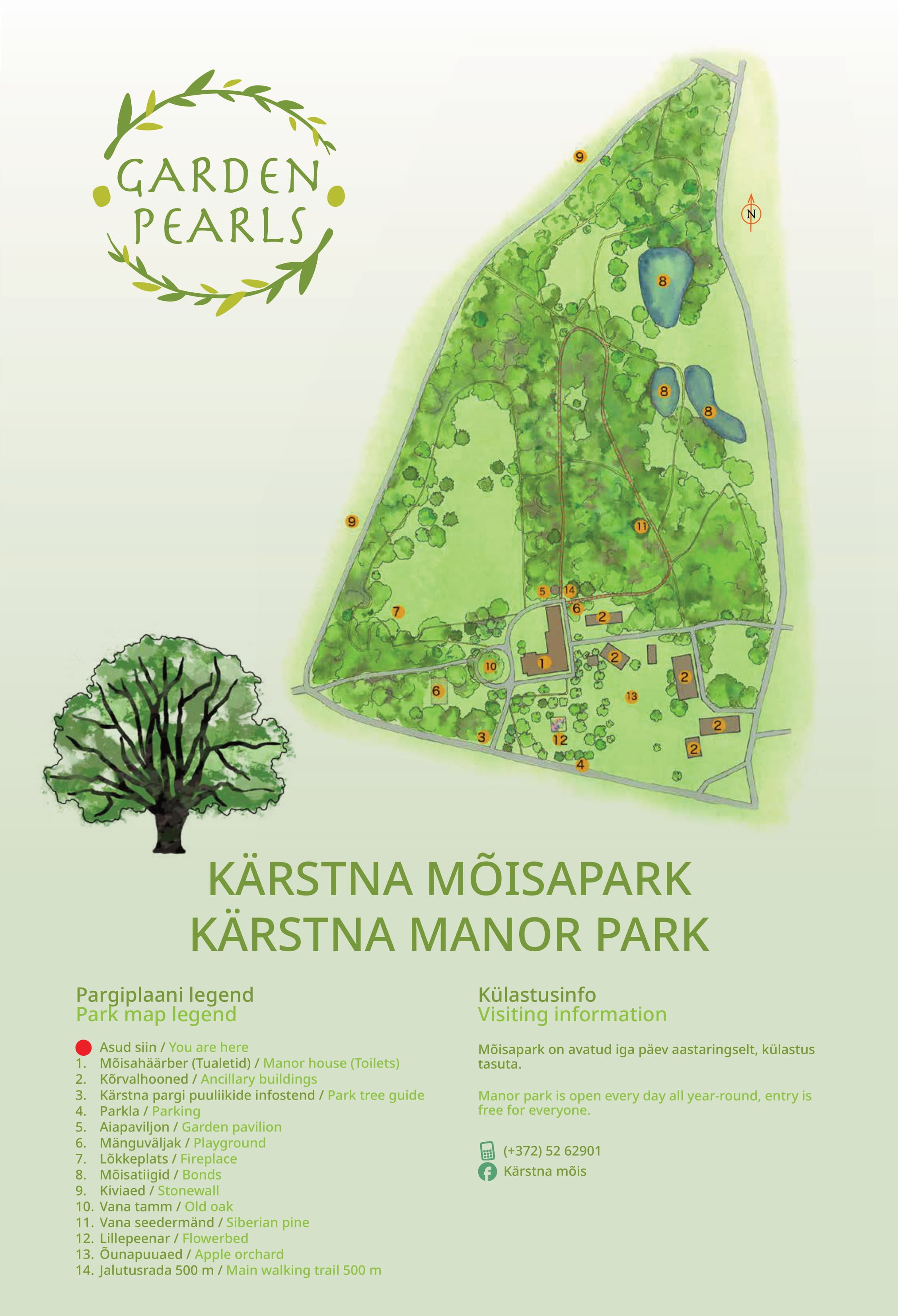 There are lots of tree species in Kärstna Manor Park. To celebrate the 100th anniversary of the Republic of Estonia, 100 tree and shrub species were labelled in the park. On the edge of the park, there is an information board with overview of all species.